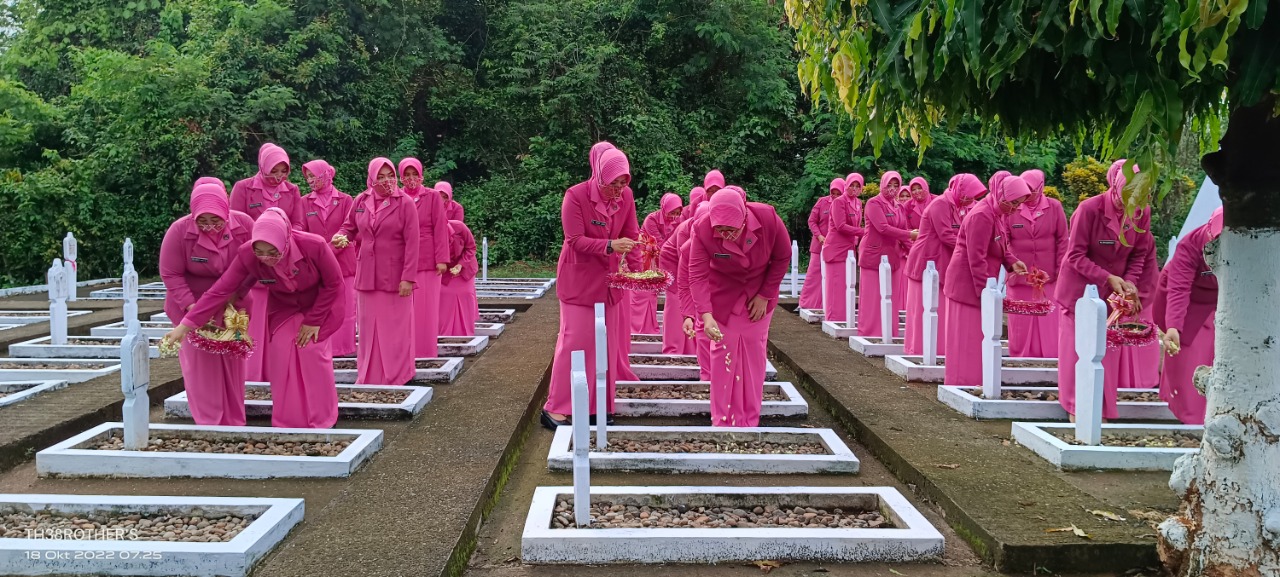 Pekalongan – Dalam Rangka memperingati Hari Kesatuan Gerak Bhayangkari (HKGB) ke-70 tahun 2022, Bhayangkari cabang Pekalongan menggelar upacara ziarah tabur bunga di Taman Makam Pahlawan (TMP) Bhakti Wiratama Bojong, Selasa (18/10).
